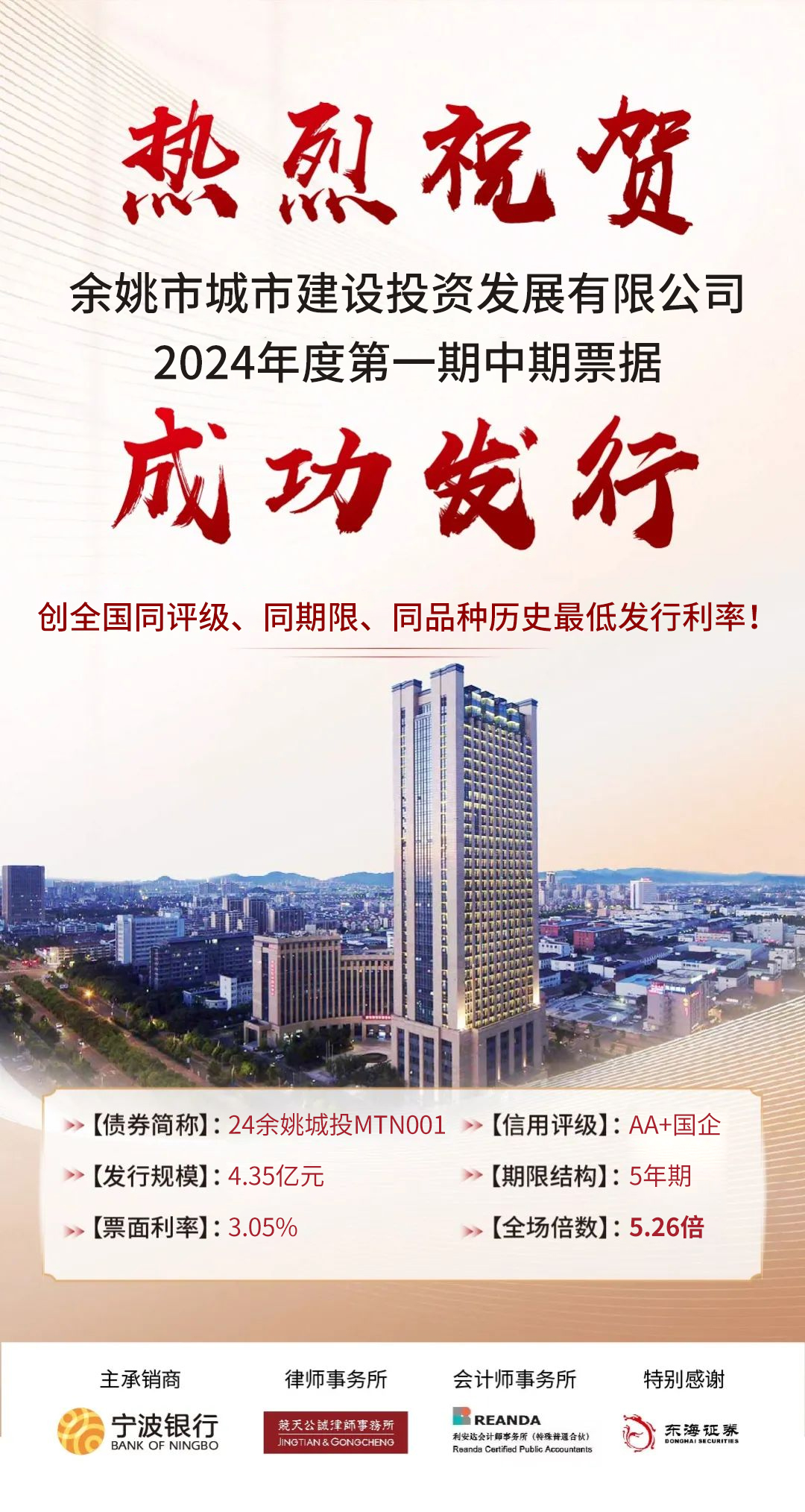1月18日,寧波舜建集團所屬市城投公司成功發行2024年度第一期中期票據4.35億元,期限5年,票面利率3.05%,全場認購倍數高達5.26倍。本次發行創下全國同評級、同期限中期票據歷史最低票面利率,全場有效認購的投資機構多達27家、認購金額近23億元。本次五年期中票的成功發行,并獲得較高的認購倍數,代表市場對舜建集團及城投公司的高度認可。
