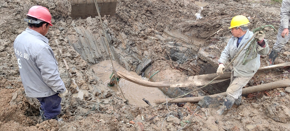 清理覆土、吊裝搶修節、嚴密包裹漏點、上螺栓……市自來水公司搶修班組默契協作,連續作業8小時,高效修復梁周線DN1000原水管1處漏點。